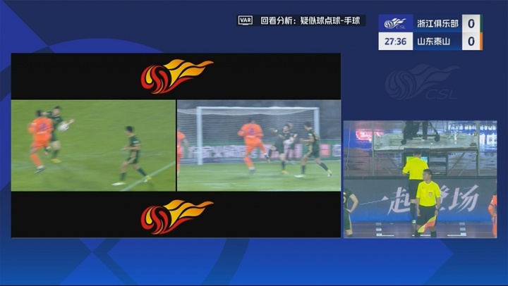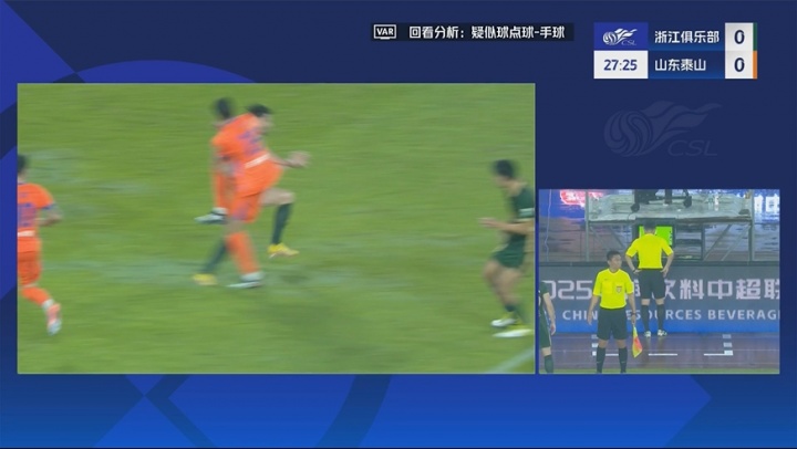 10月18日讯 中超第27轮,浙江坐镇主场对阵山东泰山,上半场第28分钟,泽卡禁区内踢球后皮球打在卢卡斯手臂上,主裁亲自回看VAR,没有判罚浙江球员禁区内手球犯规,目前比分仍为0-0。